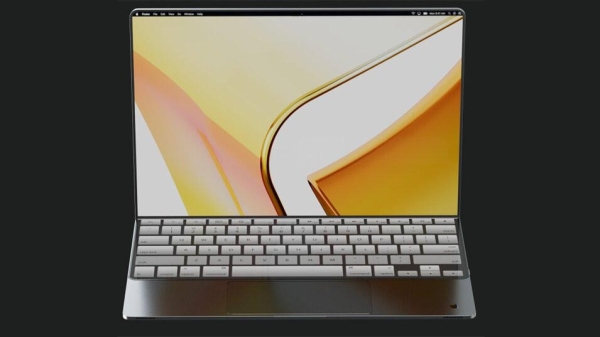Разработчики концепта предложили необычную модель MacBook без клавиатуры с гибким дисплеем на внутренней поверхности устройства. В разложенном виде крышка могла бы раскрываться на 180 градусов, а экран увеличивался бы в размерах.