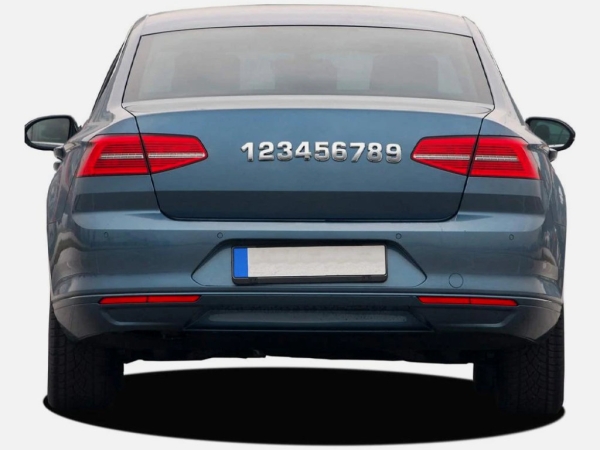 Металлические буквы и цифры на двухстороннем скотче, которые используются для декора автомобиля.