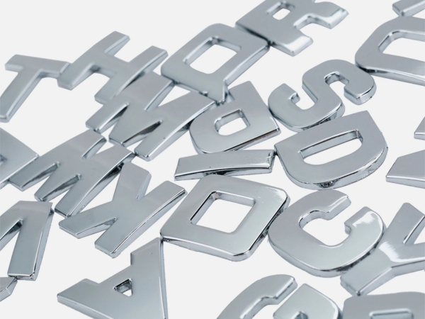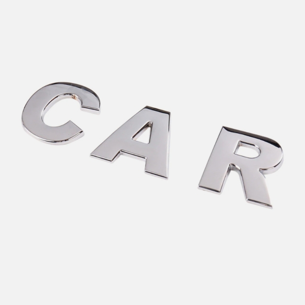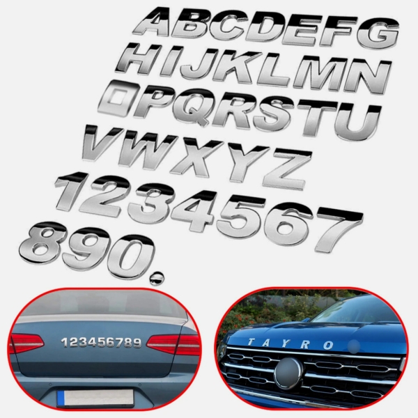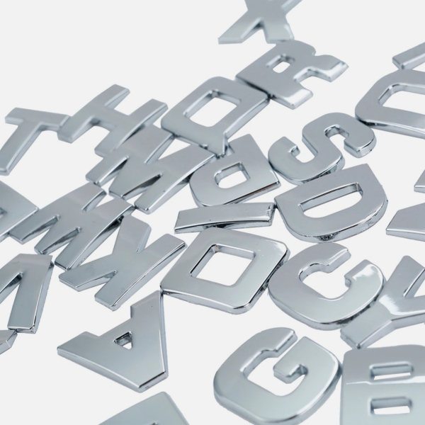 Трёхмерные металлические буквы на двустороннем скотче, предназначенные для автомобильного кузова. Продавец предлагает полный латинский алфавит, а также цифры и точку.