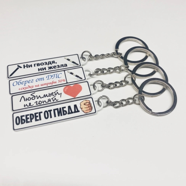 Кроме брелоков с номерными знаками, получится также заказать варианты с какими-то забавными фразами.