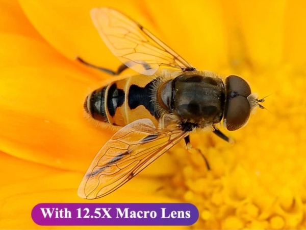 Линза 2 в 1. Это и широкий угол 0,45×, который поможет захватить в один кадр ещё больше друзей, и макро 12,5×, чтобы снимать цветы и другие объекты с максимальным приближением.