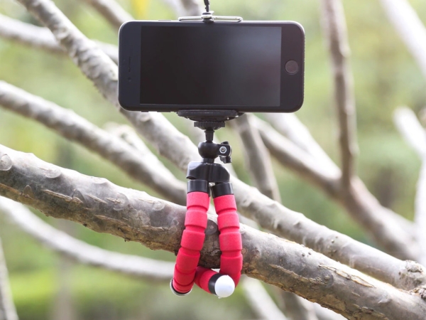 У этого штатива гибкие ножки, которые дадут возможность не только удобно разместить смартфон на более-менее ровной поверхности, но и закрепить его на ветке или ещё где-то.