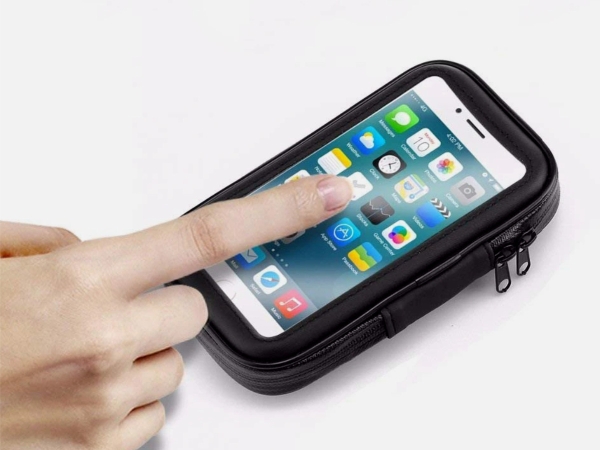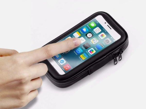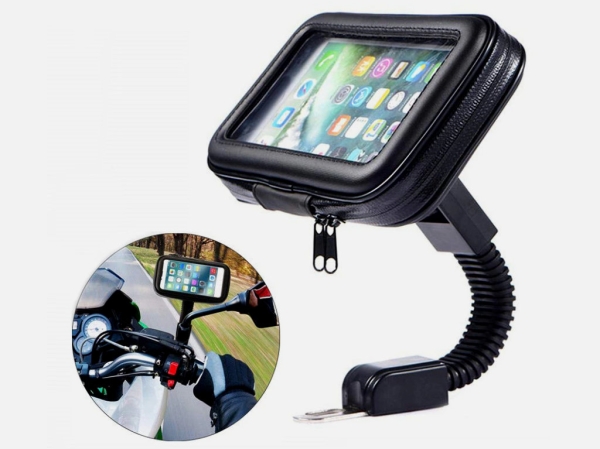 Надёжный держатель для смартфона на руль мотоцикла. Устройство вставляется в специальный чехол, который защищает его от окружающих погодных условий и падений.