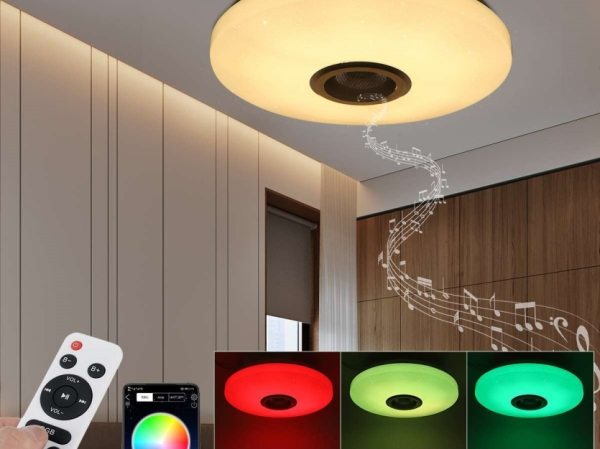 Компактный потолочный светильник мощностью 60 Вт с возможностью выбора любого цвета в RGB-спектре и встроенной Bluetooth-колонкой.