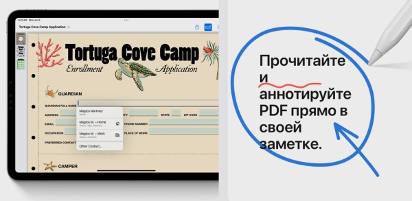 Отдельный блок презентации был посвящен работе с файлами в формате PDF. Набор опций практически полностью доступен в iOS 17, но на большом экране iPad и при наличии Apple Pencil, делать это на планшете будет гораздо удобнее.