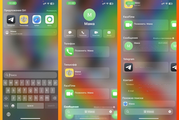 Когда вы общаетесь с кем-то по телефону или FaceTime, можно сразу же найти всю нужную информацию о контакте. Просто откройте поиск Spotlight и увидите кнопку для просмотра данных, даже вводить ничего не понадобится.