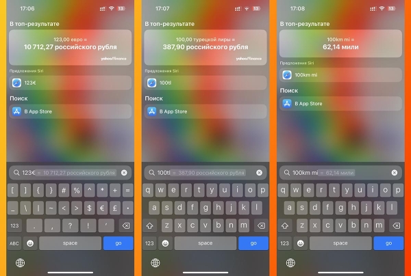 Многие знают, что поиск Spotlight можно использовать вместо калькулятора, особенно на iPad. Но не все в курсе, что умная строка умеет конвертировать валюты и величины.