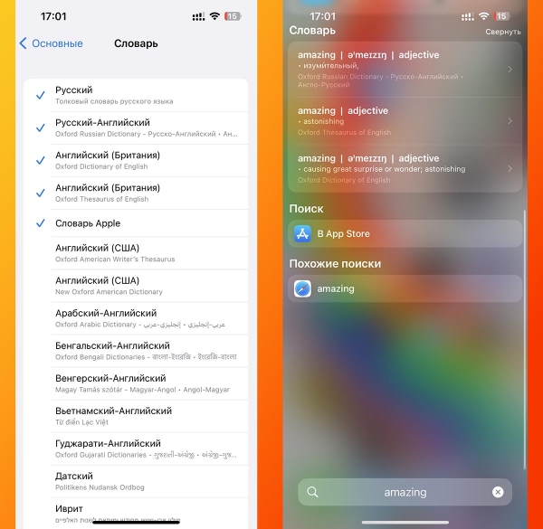Если нужно узнать значение какого-то слова, его правильное произношение или перевод на другой язык, можно воспользоваться встроенными в iOS словарями.