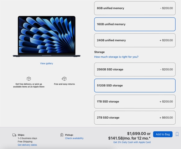 Проблема решается заказом кастомной модели, но стоимость устройство увеличивается аж на $400 (половина за два модуля SSD для быстрой скорости накопителя и половина за удвоенный объем ОЗУ). А там уже и до базового MacBook Pro 14″ недалеко.