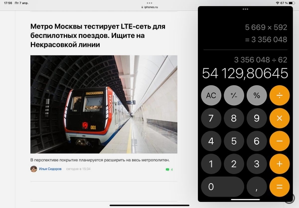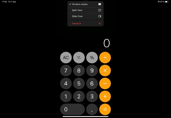 На других моделях планшетов Apple калькулятор можно открывать в режимах Split View и Slide Over. Для этого в последних версиях системы достаточно нажать кнопку с тремя точками сверху и переключиться в нужный режим.