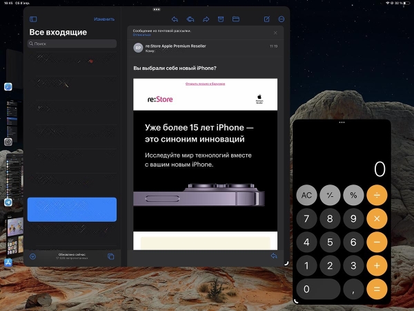 На моделях iPad с процессорами M1/M2 можно активировать режим Stage Manager (Постановщик). С ним калькулятор станет программой в отдельном небольшом окне, которое получится масштабировать и размещать в любом месте рабочего стола.