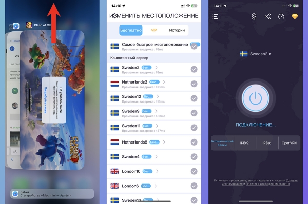 3. Бесплатный VPN-сервис. Таких приложений полно в российском App Store, они наполнены рекламой и могут передавать собранную статистику третьим лицам. Главное в случае с указанными играми, что при использовании постоянно меняющегося IP-адреса или даже страны подключения вы максимально подставляетесь под блокировку учетки.