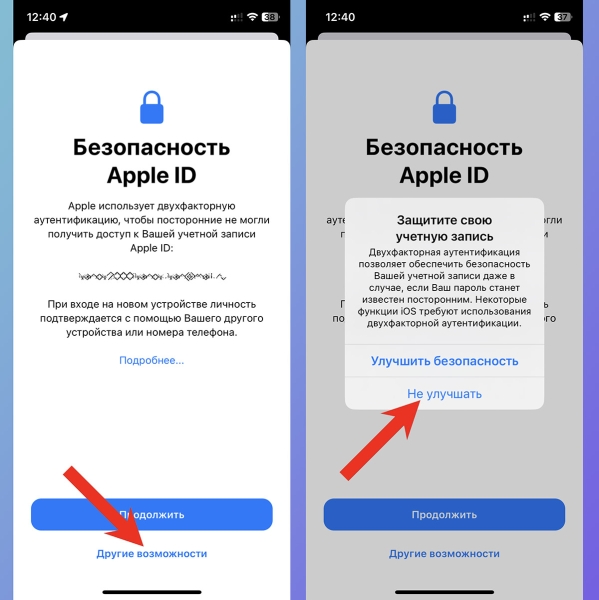Внимание! При входе в американский аккаунт обязательно откажитесь от улучшения записи и включения двухфакторной аутентификации. В противном случае вам потребуется вводить номер телефона из США, подтверждать его по СМС и в будущем авторизоваться только таким способом.