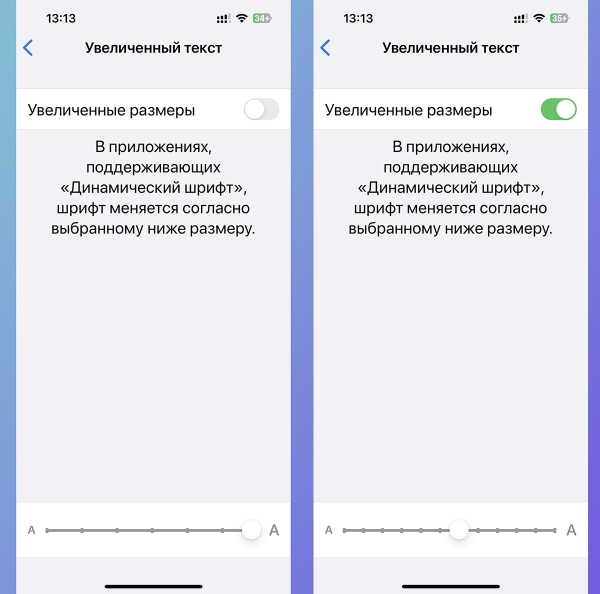 ▶ Активируйте тумблер Увеличенные размеры.