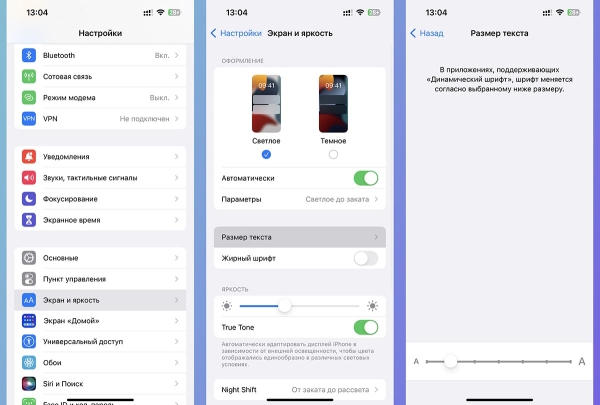 Можно сразу настроить подходящий размер текста для всех системных меню, настроек и большинства приложений одним ползунком.