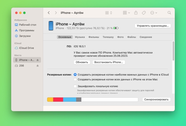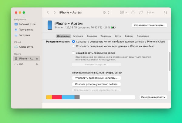 Через несколько минут на диске Mac будет создана полная копия данных iPhone. При необходимости, вы сможете перенести её на внешний или сетевой диск по нашей инструкции.
