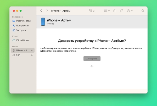 ◉ Разблокируйте мобильный гаджет, в случае появления диалогового окна, выберите пункт Доверять этому компьютеру (потребуется ввести код разблокировки iOS).