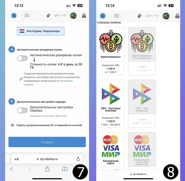 8. Оплатите сервер любым доступным способом. Есть несколько вариантов, в том числе криптовалютой, через СБП, российской или заграничной картой.