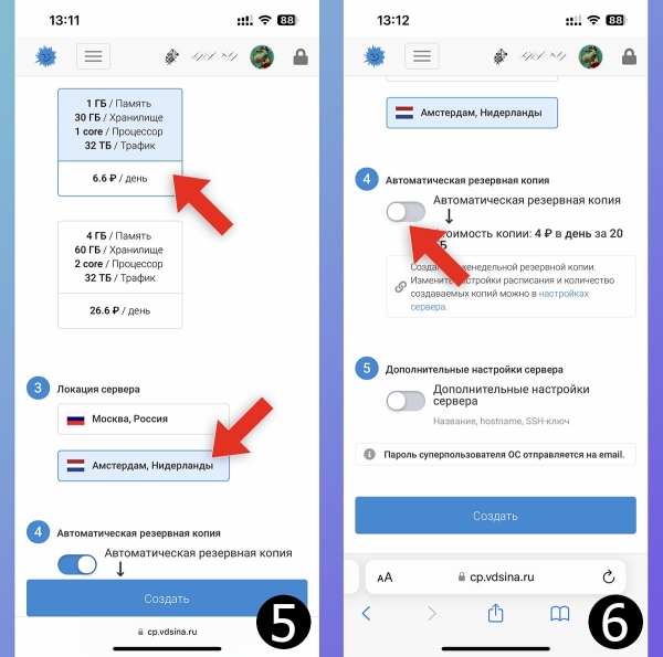 5. Далее укажите базовую конфигурацию за 6.6 руб. в сутки и поменяйте местоположение сервера на Амстердам.