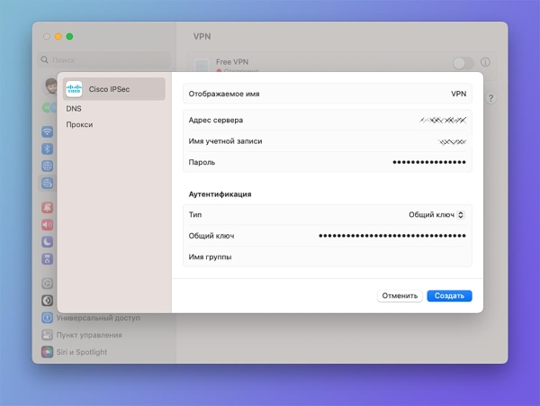 Вы можете добавить конфигурацию на компьютер Mac, введя соответствующие параметры в системных настройках.