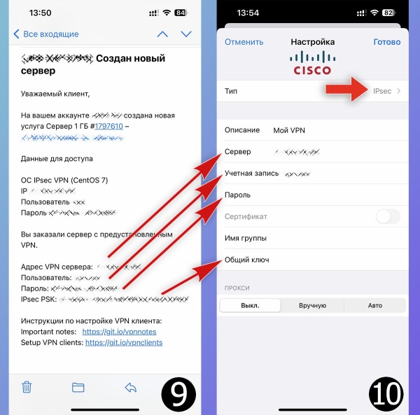 10. Перенесите данные из письма в параметры iPhone (Настройки – VPN – Добавить конфигурацию VPN). Не забудьте поменять тип соединения на IPsec.