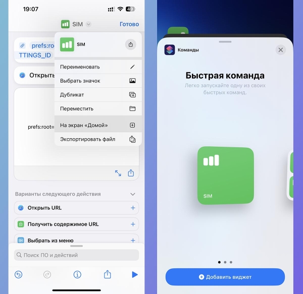 6. Добавьте ярлык для запуска быстрой команды из меню настроек или разместите виджет Команды на рабочем столе.