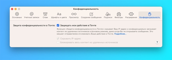 Специальная фишка macOS позволяет скрывать ваши действия в стандартном почтовом клиенте Mac. Система не будет рассекречивать ваш IP-адрес при загрузке контента в письмах и по возможности будет скрывать адрес электронной почты для неизвестных получателей.