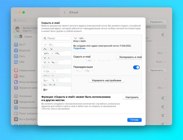 Просмотреть уже созданные адреса, отключить перенаправление писем на основную почту или добавить новый ящик можно в разделе Системные настройки — Учетная запись Apple ID – iCloud – Скрыть e-mail.