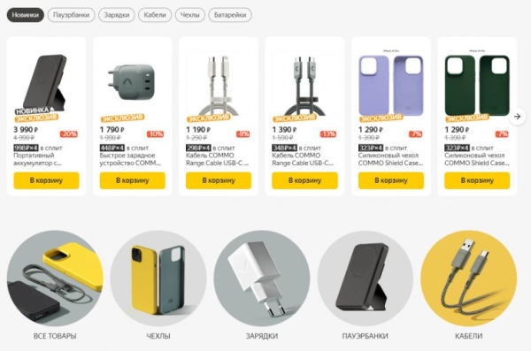 Зарядки, кабели, чехлы для телефонов, батарейки и другие товары Commo появились на площадке Яндекс.Маркета в конце марта прошлого года.