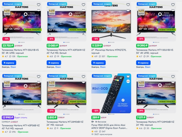 В компании говорят, что запуск продаж ТВ Hartens прошел удачно, и сейчас СТМ маркетплейса «является лидером по штучным продажам среди B-брендов». Теперь телевизоры этой марки продаются только на «Озоне», однако мне удалось найти несколько моделей на «Яндекс.Маркете». Скорее всего, это остатки товаров до покупки бренда.