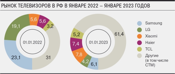 Интересно, что сейчас в России на СТМ приходится огромная доля товаров, продаваемых в рознице. О продуктах питания вы можете судить сами по обилию СТМ в «Пятерочке», «Вкусвилле», «Ашане», «Перекрестке» и других. Но обратите внимание на долю собственных марок на отечественном рынке телевизоров. Впечатляет!