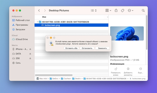 7. Замените стандартную картинку в открытой ранее папке новым файлом lockscreen.png и перезагрузите Mac.