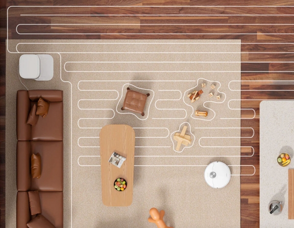 Первичный замер пространства пылесос прокладывает круговым проездом по периметру каждой комнаты. После он змейкой очищает оставшееся пространство, постоянно записывая маршрут в память.