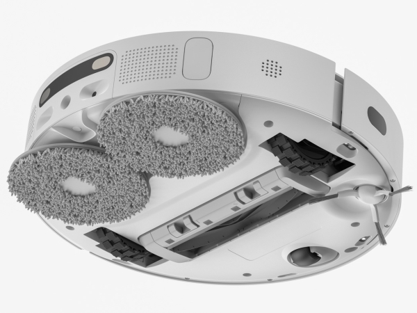 Салфетки из микрофибры для влажной уборки находятся в задней части. Когда придёт время замены, их тоже удобно отсоединять от корпуса благодаря тому, что держатся на магнитах. Во время уборки пылесос автоматически подкручивает их вверх или вниз, чтобы при заезде на ковёр не возить по ворсу вхолостую.
