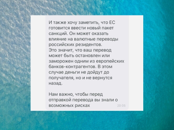 Связано это с тем, что Евросоюз может ввести санкции против банка. Отмечается, что перевод могут заблокировать банки-корреспонденты. В таком случае деньги вернутся обратно на счет.