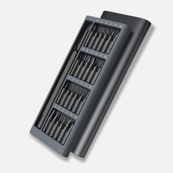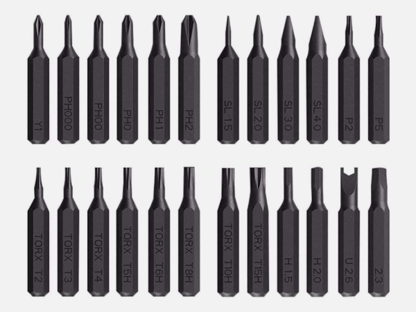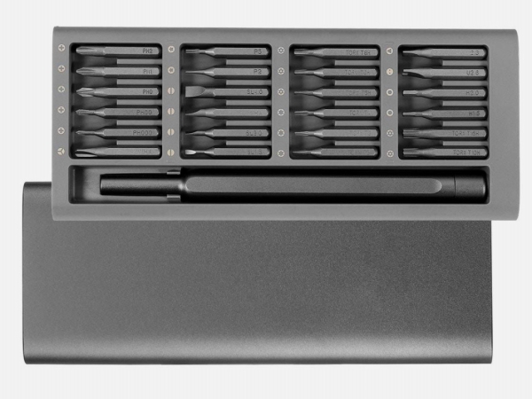 Комплект поставки включает 24 биты для самых разных головок. Все они вместе с основным инструментом упакованы в приятный футляр.
