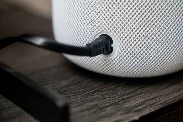 Я заменил прилагаемый плетеный шнур на простой черный кабель питания от другого устройчтва, и HomePod заработала нормально.