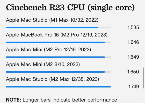 Что касается производительности, то мы тестировали разные версии Mac Studio. 38-ядерный графический процессор в M2 Max обеспечивает примерно на 20% лучшую производительность Metal по сравнению с 32-ядерным графическим процессором в M1 Max, почти полностью из-за увеличения количества ядер.