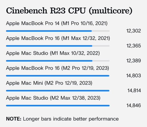 Между тем, ThinkStation P620 поставлялся с AMD Ryzen Threadripper Pro 5995WX, 128 ГБ оперативной памяти и более высококлассным графическим процессором Nvidia RTX серии A. В Cinebench R23 Mac Studio опередил предыдущую модель с M1 Ultra почти на 18% – близко к заявленному 20% увеличению от